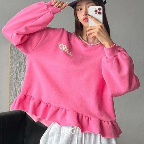 [다잇템_패션]여자 분홍색 보온 필기체 귀여운 프릴 맨투맨