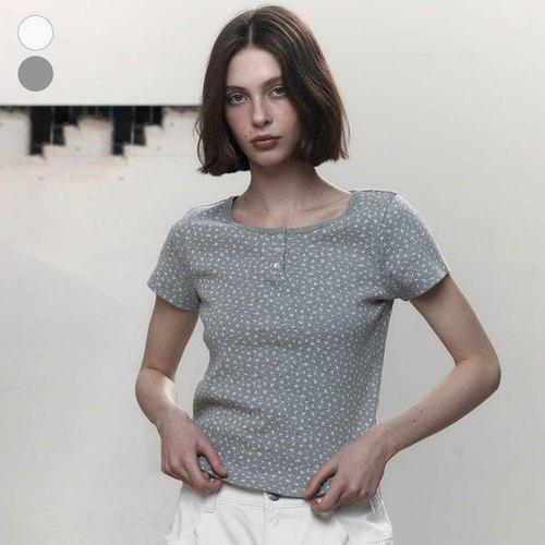 [스콰즈] 여자 골지 단추 헨리넥 티셔츠 스판 U넥 크롭 반팔티 SCR196