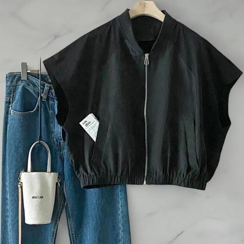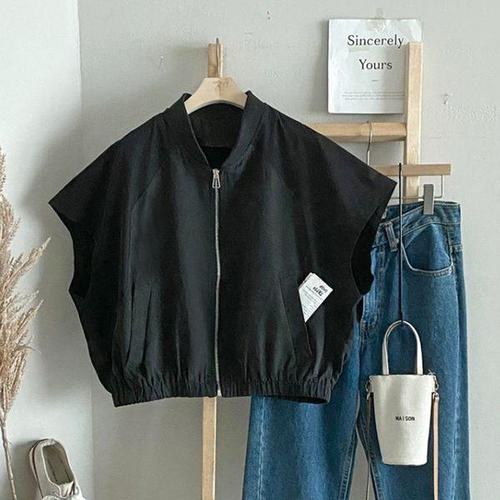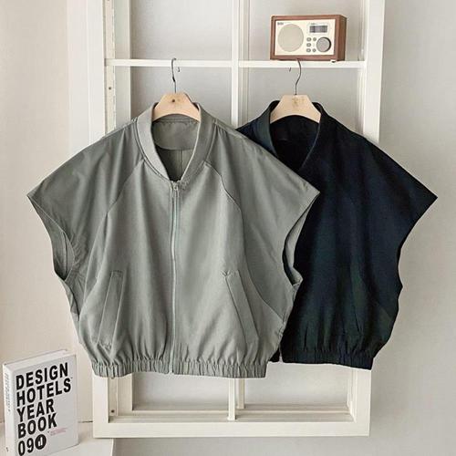 [다잇템]여자 헨리넥 집업 클래식 반소매 컷아웃 베스트