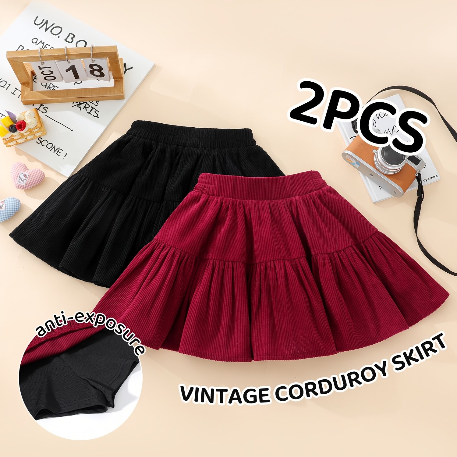 TEMU 2개, 여아용 가을/겨울 스커트, 중대형 키즈 코듀로이 드레스, 안전 안감 투명 방지 패셔너블 빈티지 클래식 레드 + 블랙|가을원피스