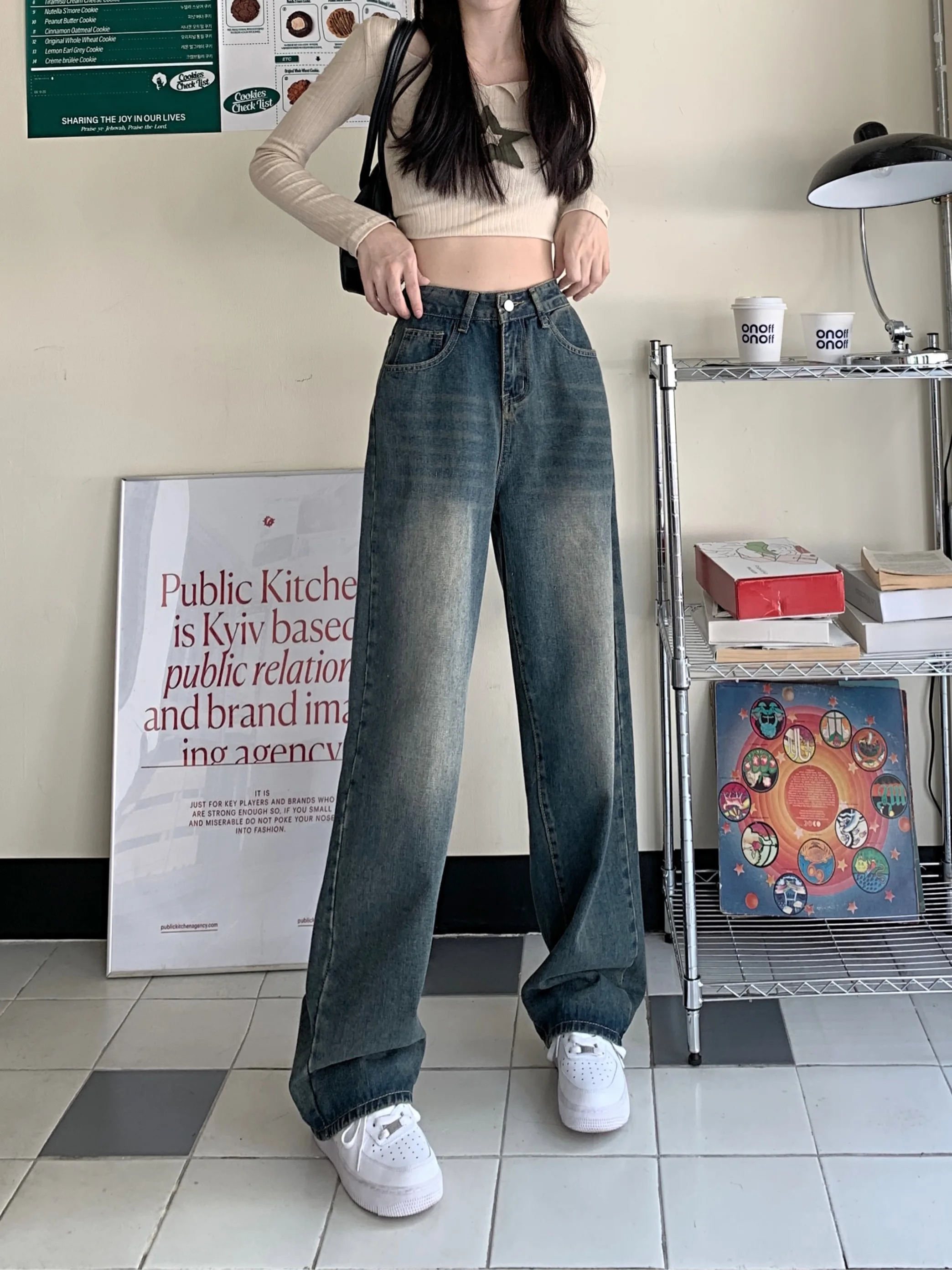 워싱 데님 팬츠 루즈핏 아메리칸 스타일 브랜치 여름 캐주얼 와이드 레그 스트레이트 컷 진 로우 웨이스트 롱 트라우저