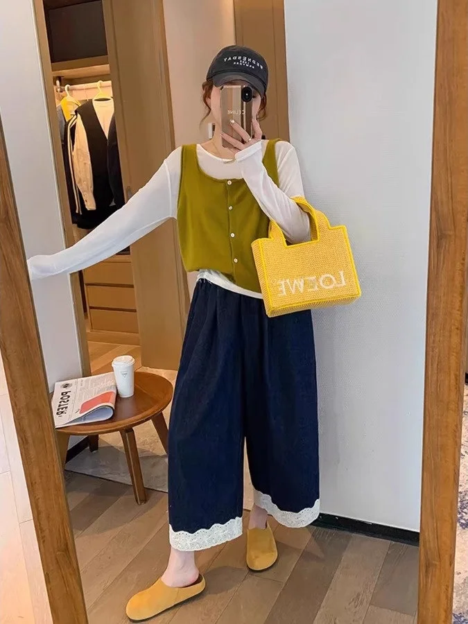 딥 블루 레이스 스플라이싱 청바지 여성 여름 캐주얼 스트레이트 레그 나인 포인트 슬리밍 와이드 레그 팬츠 하이 웨이스트 데님