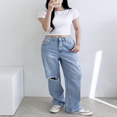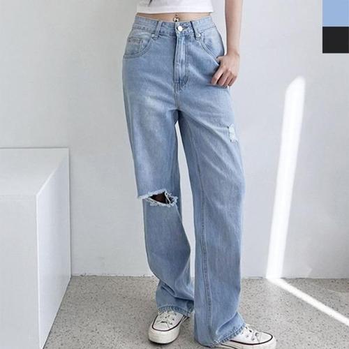 해피유통여성 하이웨이스트 찢어진 와이드 청바지 개성있는 일자핏 팬츠 XG26