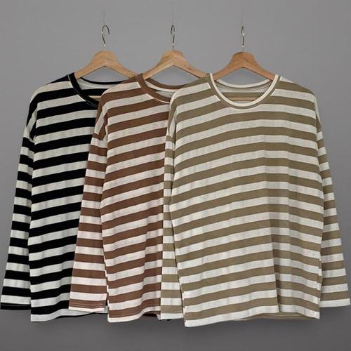besteffie 여성 맨투맨티 라운드넥 컴포트핏 레이어드 맨투맨 언발런스 스트라이프 티셔츠 캐주얼 K39