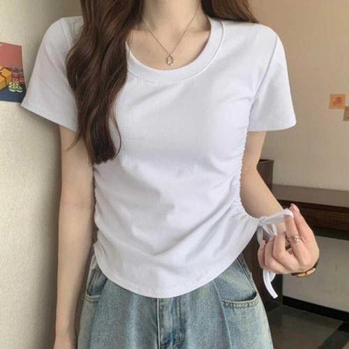 [셀러허브_여성트랜드패션]ONM 셔링 스트링 반팔티 크롭티 라운드넥 데일리룩 코