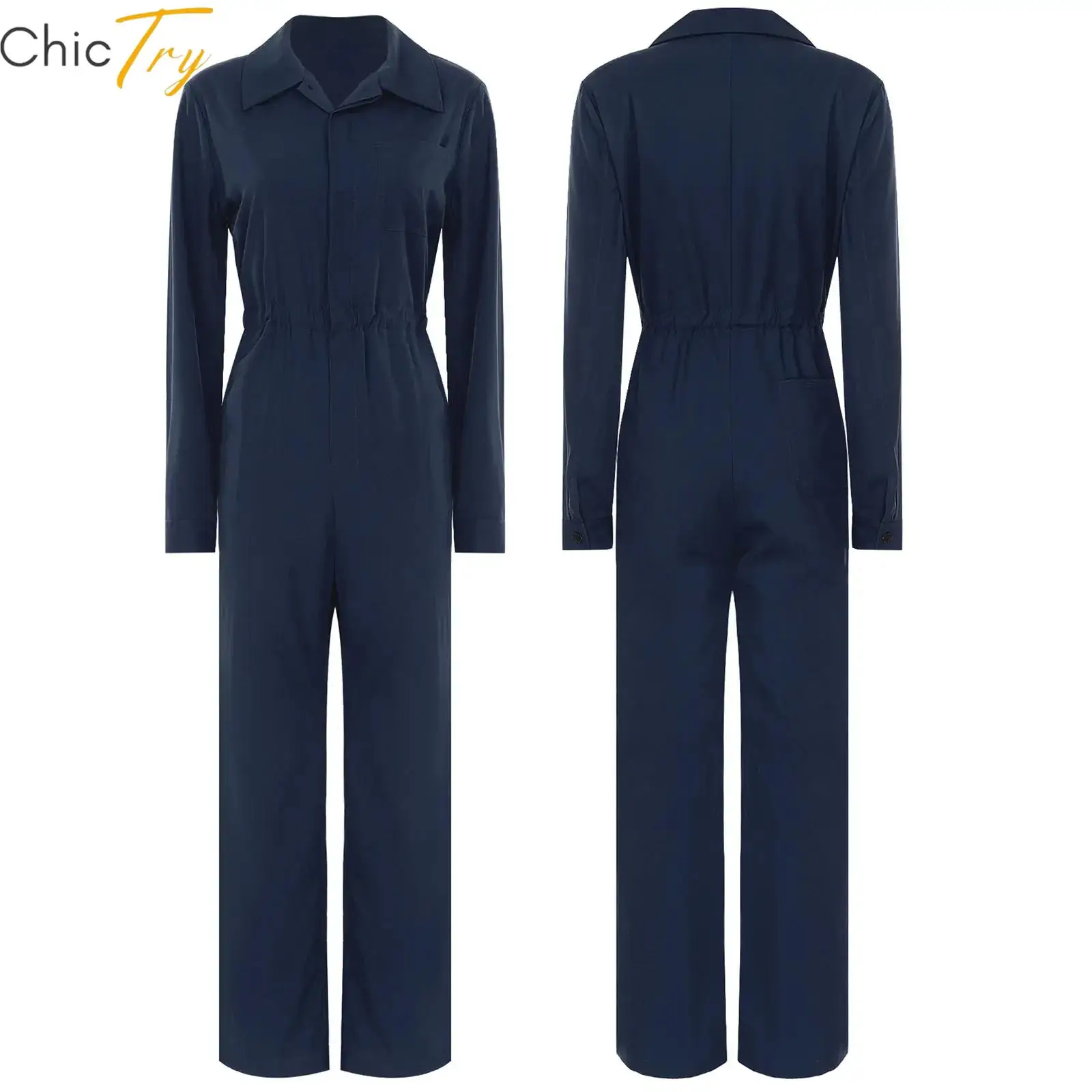 여성용 버튼 작업복 롬퍼 캐주얼 단색 턴다운 칼라 버튼 플랩 긴팔 정비공 작업복 점프수트