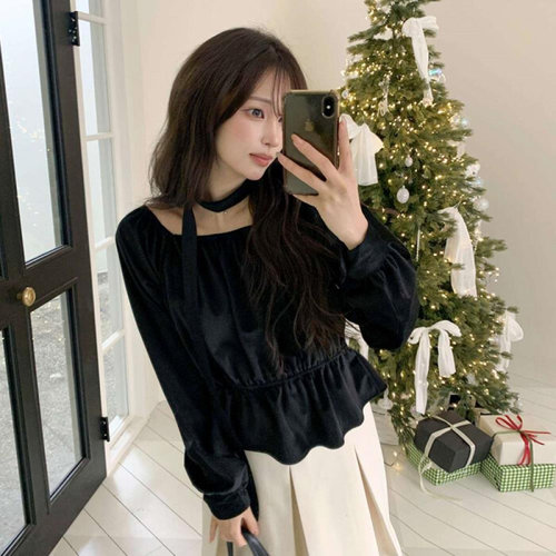 [옷자락]여자 연말 데이트룩 벨벳 리본 크롭 블라우스