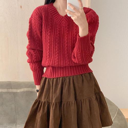 [옷자락]여자 레드스웨터 브이넥 꽈배기 겨울 연말룩 니트