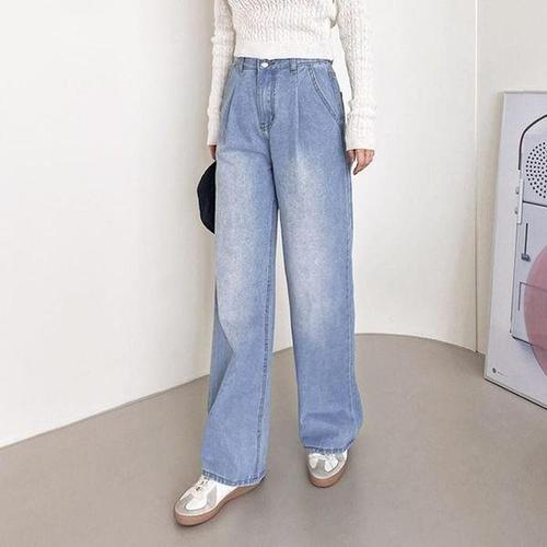 [셀러허브_여성트랜드패션]ONM 여자 핀턱 와이드 데님 본 가을 연청청바지