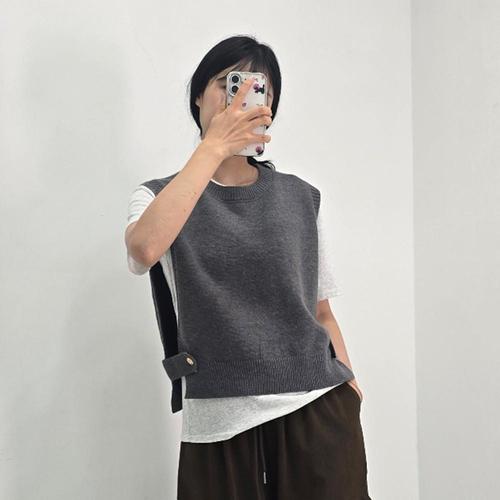 바이단미 여성 니트 베스트 끈 트임 라운드넥 박스핏 레이어드 옆트임 스트링 루즈핏 조끼