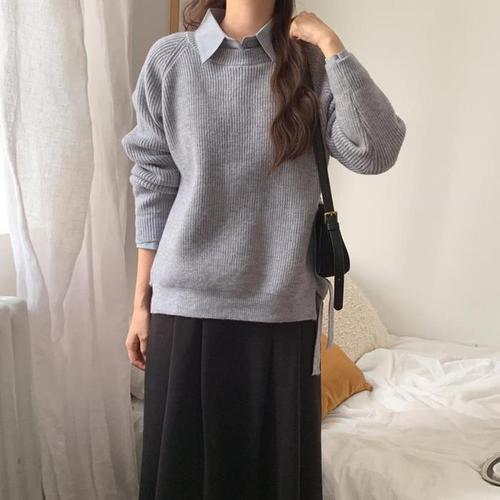 [옷자락]여자 겨울 레이어드 셔츠 옆트임 스트랩 니트 세트