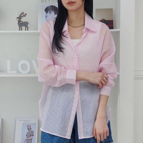 [신상오픈런]여자 스트라이프 시스루 옆트임 긴팔 셔츠