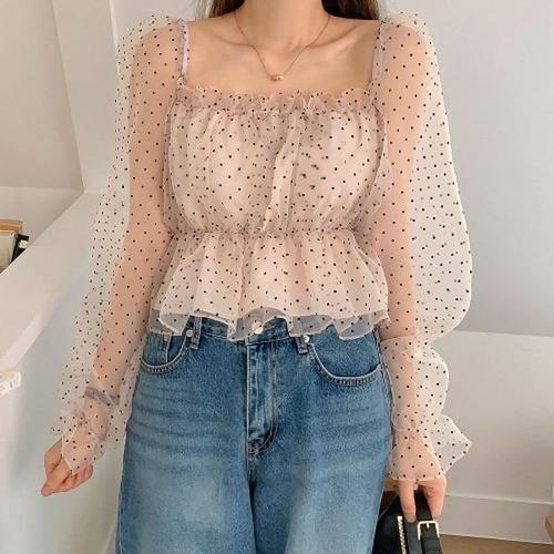 [다잇템]여성 사각 프릴 땡땡이 오간자 비침 블라우스