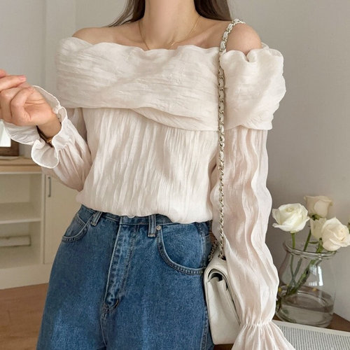 플러리싱 / 오프숄더 물결 주름 프릴소매 노방 블라우스 플러리