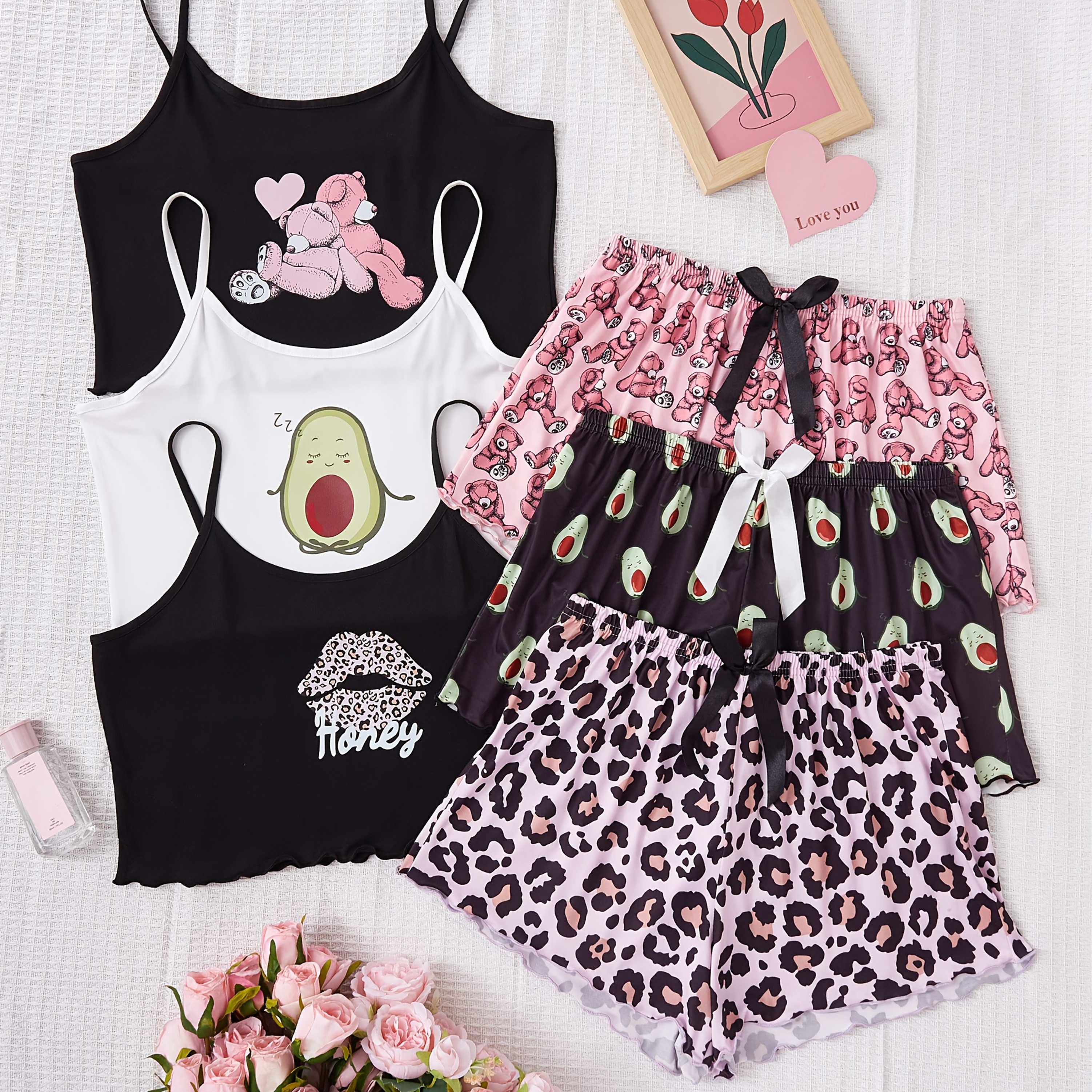 TEMU 3pcs 여성용 귀여운 핑크 곰 & 입술 카미 탑과 반바지 잠옷 세트, 만화 패턴, 폴리에스테르, 얇은 스트랩, 성인용 올 시즌 잠옷 세트.