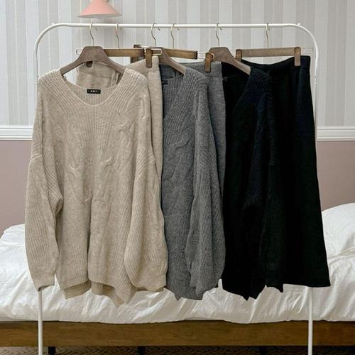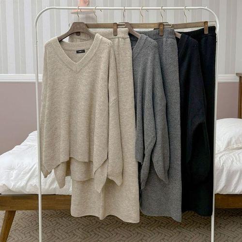[옷자락] 여성 오버사이즈 브이넥 니트 상하의 세트