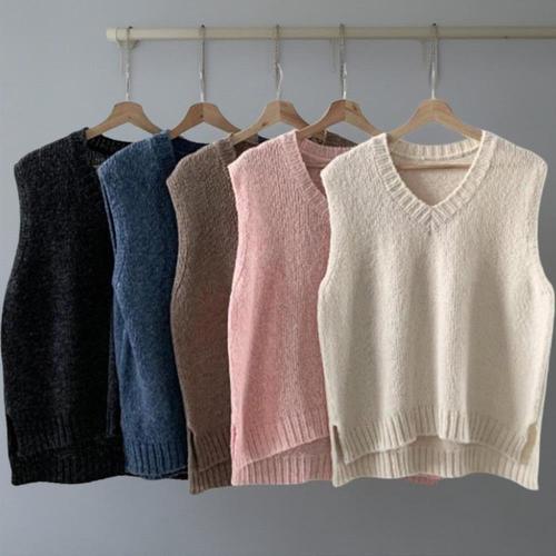 [신상오픈런]여성 언발란스 브이넥 루즈핏 오버사이즈 니트 조끼 옆슬릿