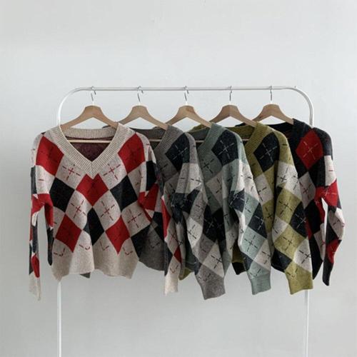 [옷자락]여성 아가일V넥 오버사이즈 가을니트