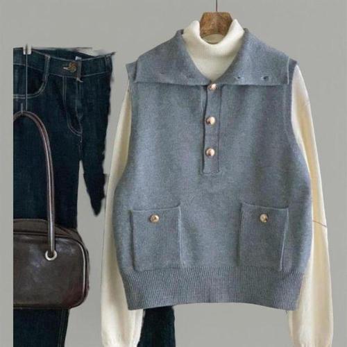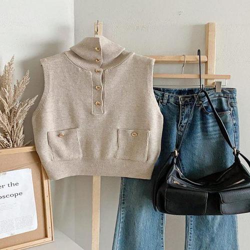 [신상오픈런]여성용 오버사이즈 금속 버튼 터틀넥 니트 베스트