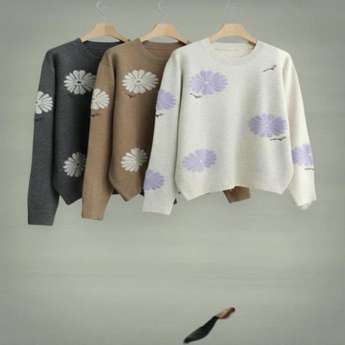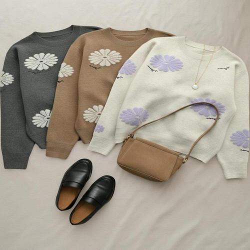 [미라클세븐]여성용 사랑스러운 플라워 패턴 라운드넥 오버사이즈 긴팔 니트