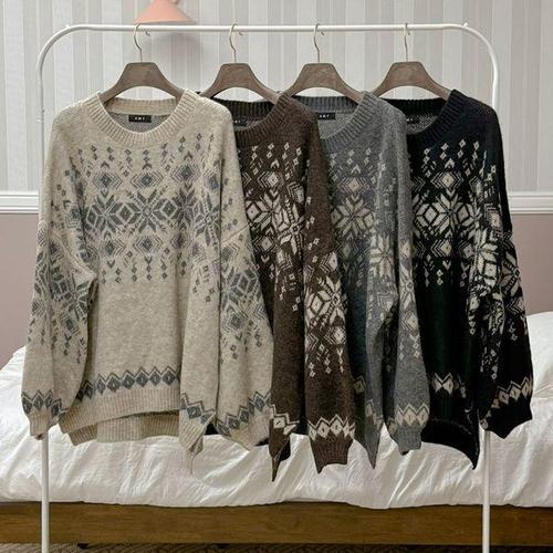 [옷자락]여성 눈꽃 노르딕 오버사이즈 긴팔 라운드 니트