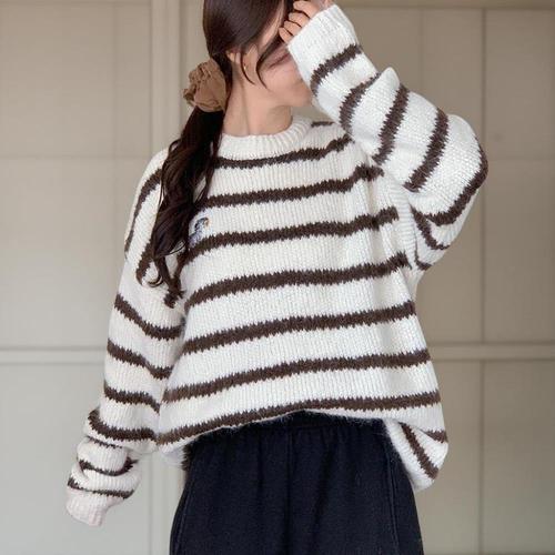 [미라클세븐]여성 오버사이즈 루즈핏 자수 스트라이프 라운드넥 부클 니트