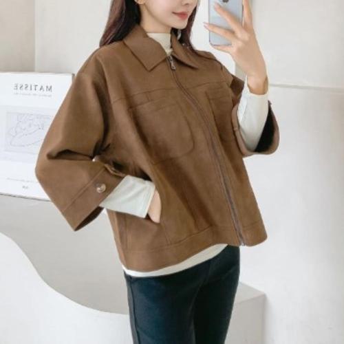 여성 키치무드 스웨이드 카라넥 크롭 루즈핏 재킷