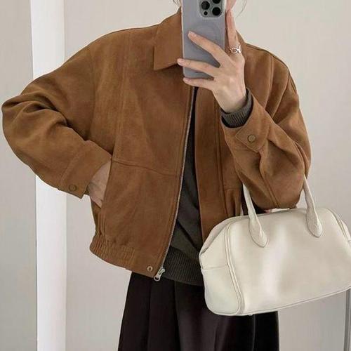 [삐까삐까]여성 스웨이드 블루종 점퍼 세미크롭 루즈핏 카라넥 집업 아우터 가을 겨울 데일리룩