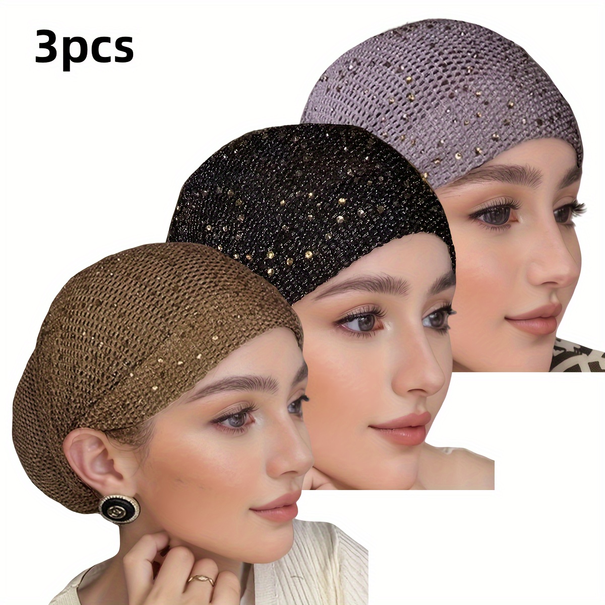 TEMU 3개/새 봄 매듭 비니 우아한 단색 폴리에스터 여성용 헤어밴드, 편안하고 가벼운 라인스톤 장식이 있는 브림리스 모자