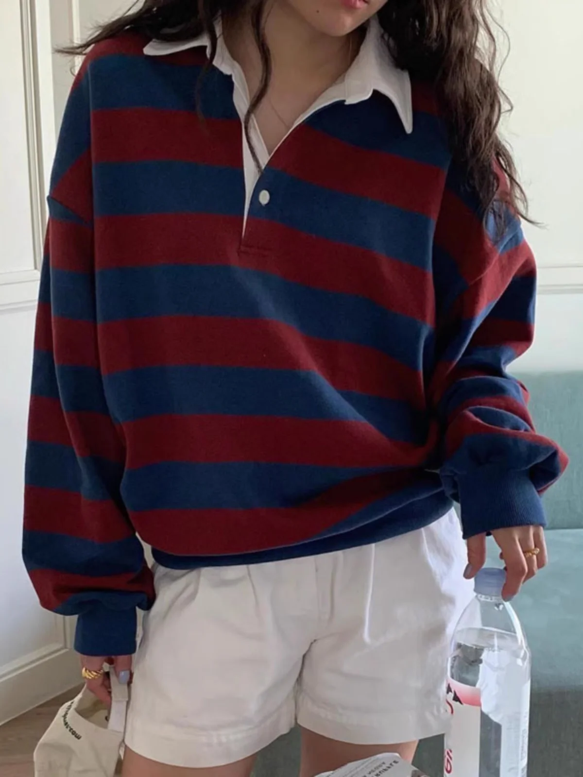 아메리칸 오버사이즈 스트라이프 스웨트셔츠 여성용 가을 신상 레이지 스타일 루즈핏 다용도 긴팔 탑 코트 스트리트웨어