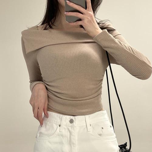 cammello 타이트 원숄더 슬림핏 셔링 긴팔 티셔츠 오프숄더 크롭티