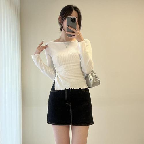 [옷자락]여자 날라리 허리단추 슬릿 골지 보트넥 기모 티셔츠