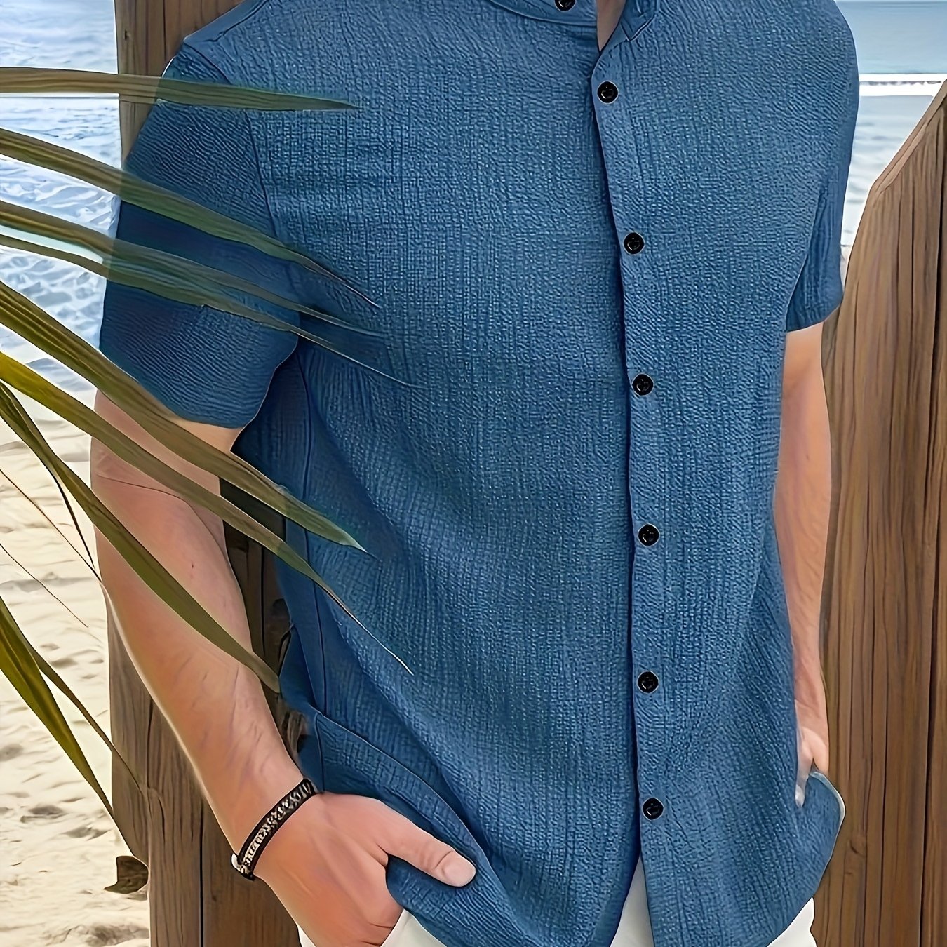 TEMU 일룬 남성용 캐주얼 반팔 버튼업 셔츠 - 부드러운 폴리에스터, 스탠드업 칼라, 세탁기 사용 가능, 솔리드 화이트, 비침 방지 원단의 통기성 여름용 해변 및 캐주얼 외출용