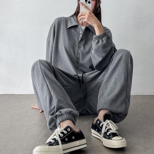 [신상오픈런]여성 스트링 카라넥 와이드 조거핏 점프수트 잔단추
