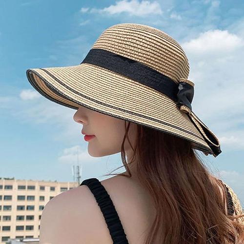 돌돌이 와이드챙 백리본 포인트 여성 왕골모자 썬캡