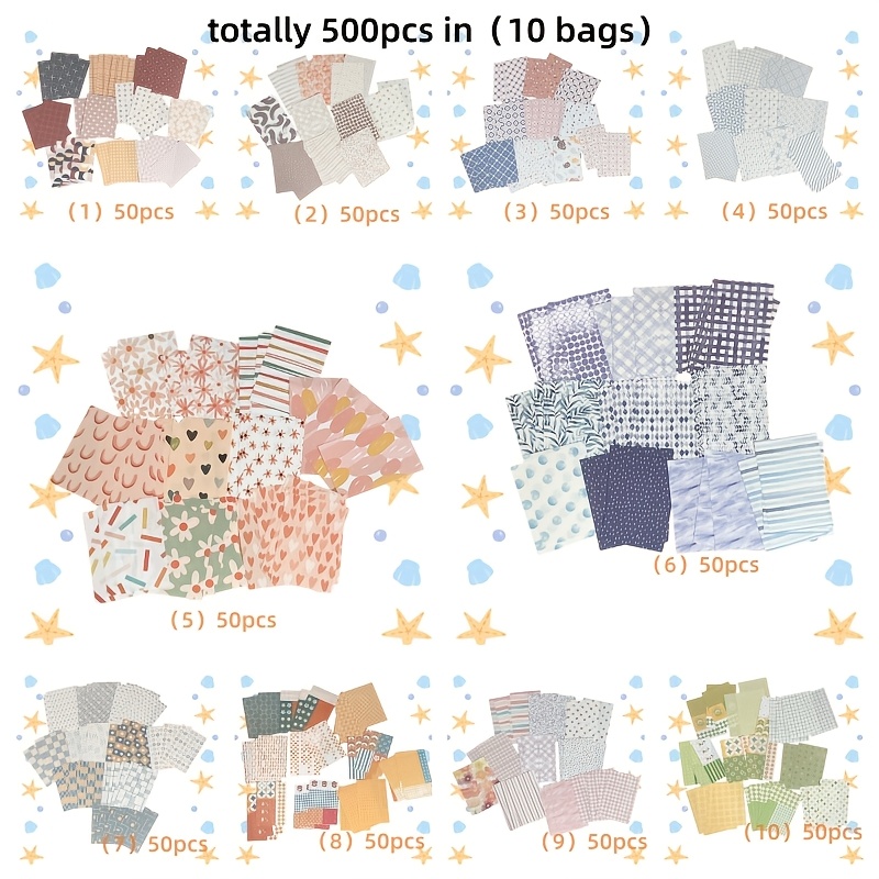 TEMU 스크랩북용으로 사용할 수 있는 500매의 다양한 색상의 종이 팩, 10개의 가방으로 구성된 창의적인 크래프트 종이 세트, 사각형 모양의 패턴으로 구성된 종이 팩, 일기장, 플래너, 콜라주 제작에 사용할 수 있는 종이 팩|일기장
