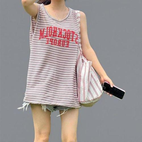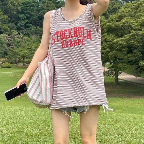 [신상오픈런]여성용 빅사이즈 스트라이프 레터링 롱 나시 바캉스용 워터밤