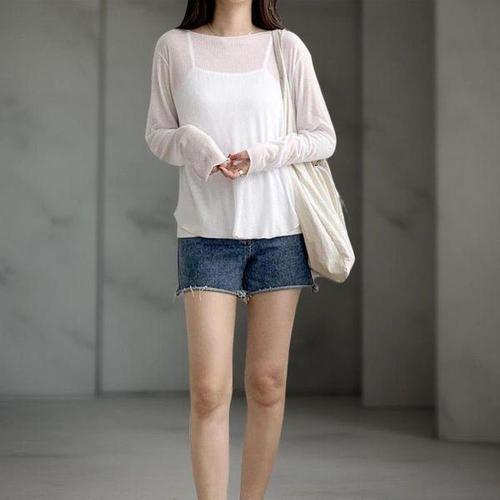 [옷자락] 여성 여리핏 시스루 워터밤 보트넥 긴팔 골지 티셔츠