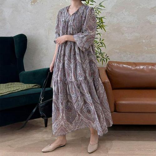 [드리다]봄 여름 여자 브이넥 프릴 쉬폰 빅사이즈 프린팅 롱 원피스 40-50대 중년여성 엄마옷 하객 상견..