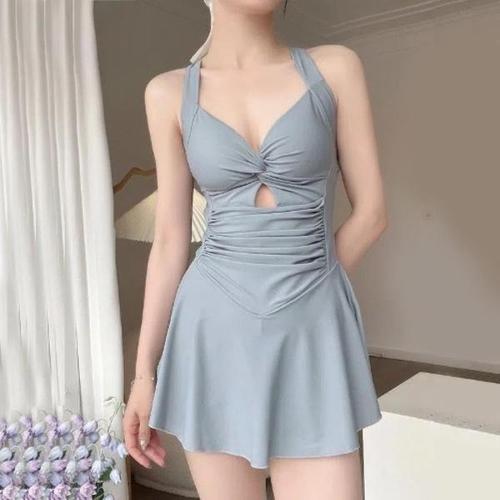 [옷자락]여자 홀터넥 셔링 플레어 스커트 체형커버 원피스 수영복