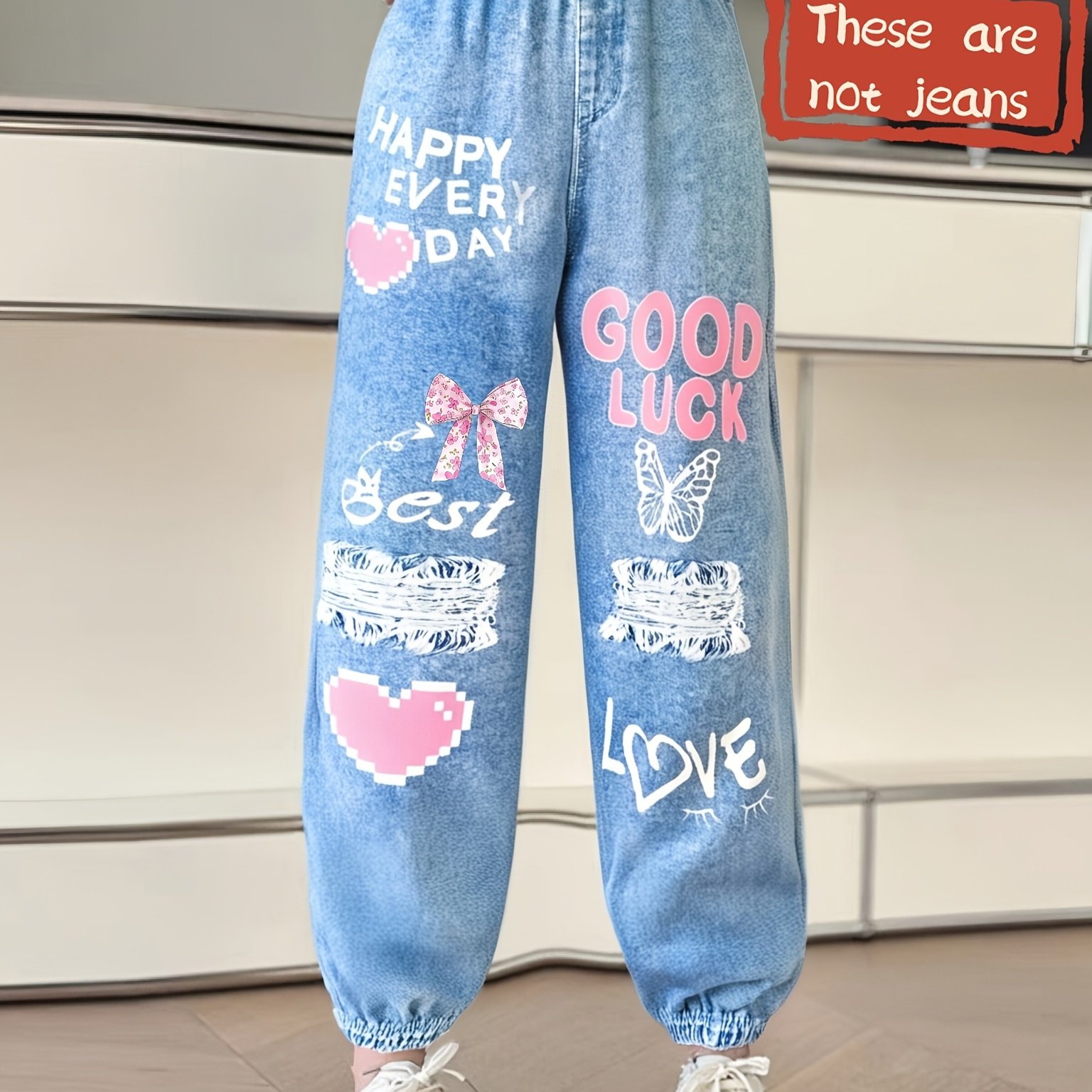 TEMU 하트 & 디자인 3D 디지털 프린트 여아용 조거 팬츠 - 루즈핏 탄성 허리 밴드, 신축성 없는 원단, 캐주얼 외출 & 놀이 친구 데이트용 롱 기장, 야외 활동용