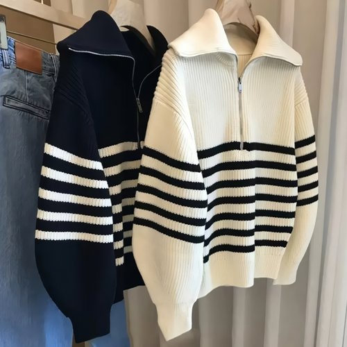 TEMU 남성 패션 캐주얼 텍스처 자카드 지퍼업 하프 지퍼 긴팔 패치워크 니트 스웨터 - 가을과 겨울용