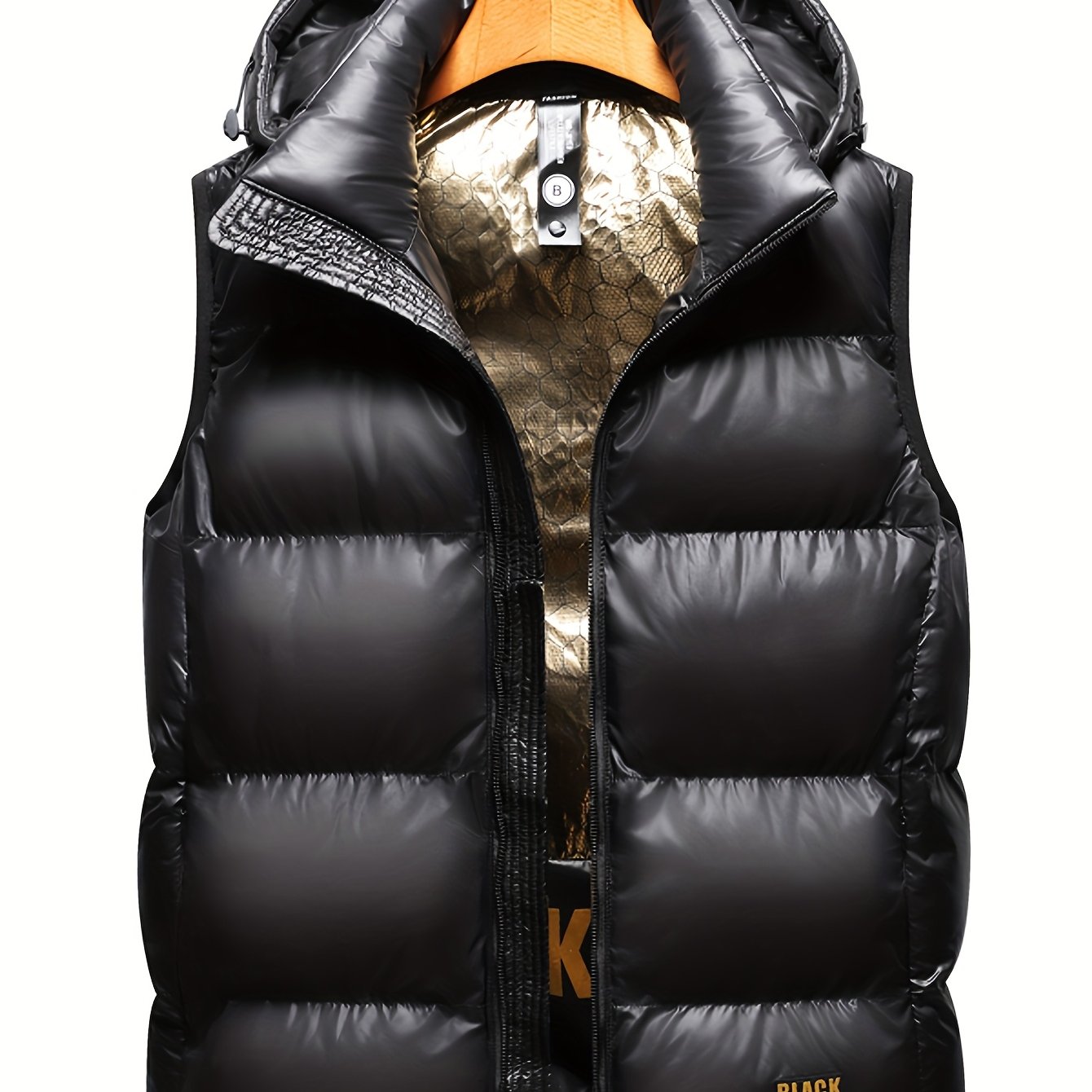 TEMU 블랙 후드 패딩 조끼 - 캐주얼 스타일, 신축성 없는 원단, 단색, 레귤러 핏, 폴리에스터 충전, 가을 야외 활동에 이상적, 캐주얼 의상 조끼|캐주얼 스타일 조끼|폴리에스터 충전 조끼, 후드 조끼