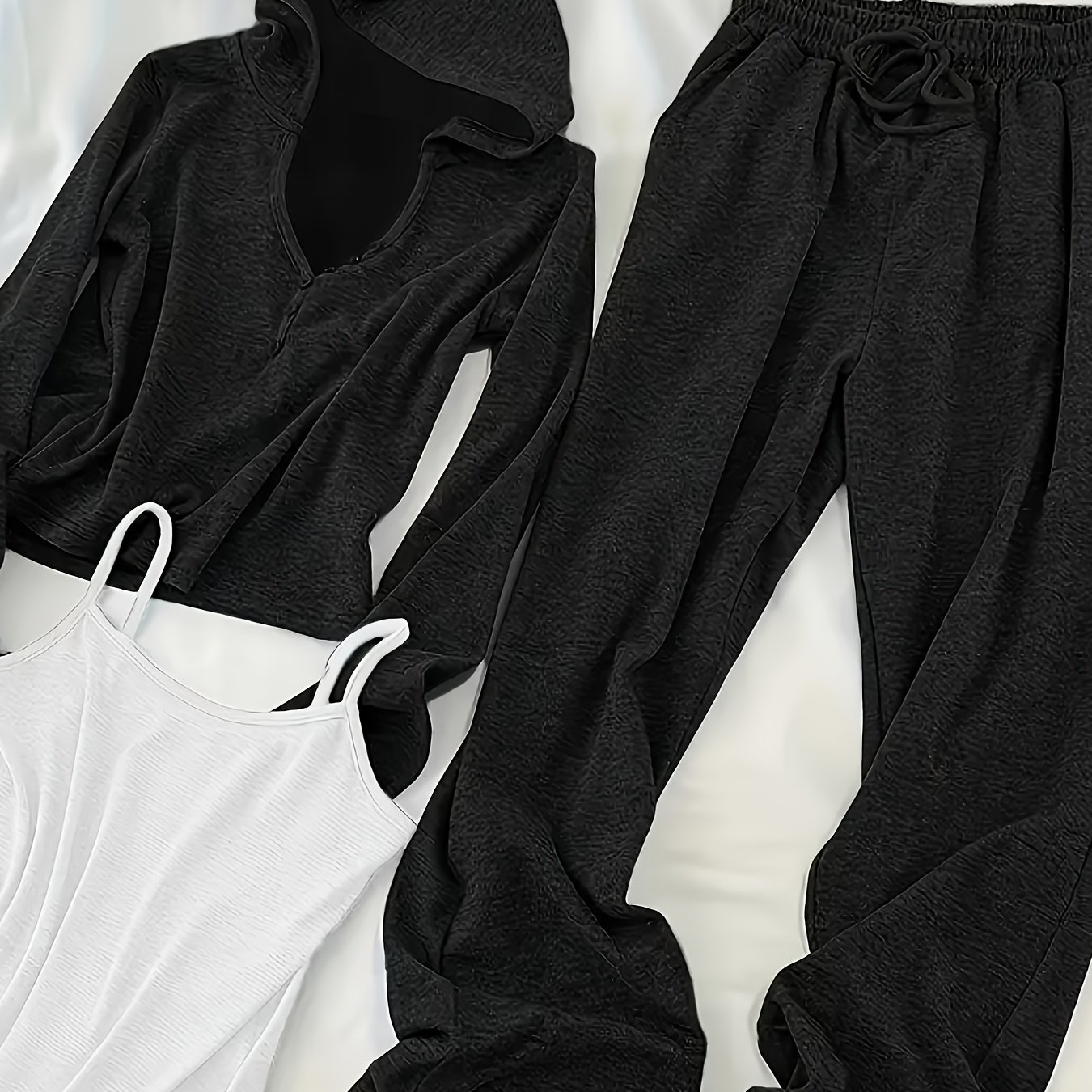 TEMU 3pcs 여성 캐주얼 의상 - 흰색 탱크 탑과 프릴 스트랩, 검은색 후디 & 조거 세트, 부드러운 폴리에스터 블렌드, 봄/여름 컬렉션, 편안한 핏 의류 | 프릴 디테일 탑 | 폴리에스터 블렌드