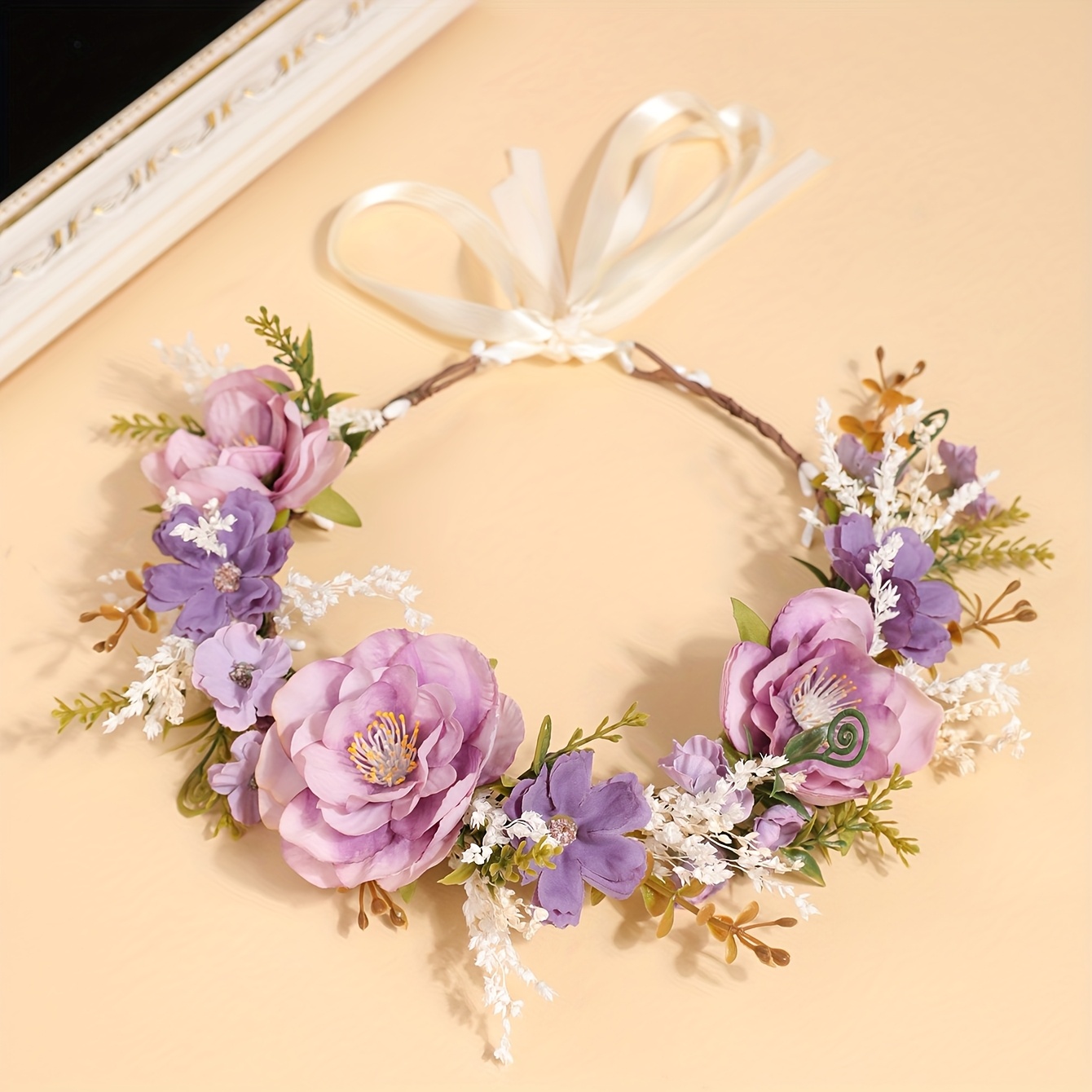 TEMU 1개 우아한 한국 스타일 인조 꽃 화환 헤어피스 - 파스텔 핑크 라일락 라벤더 화이트 베이비스 브레스와 그린 리프, 웨딩 신부 부케 헤어 액세서리, 프로포즈, 포토 촬영 및 캐주얼 의상용