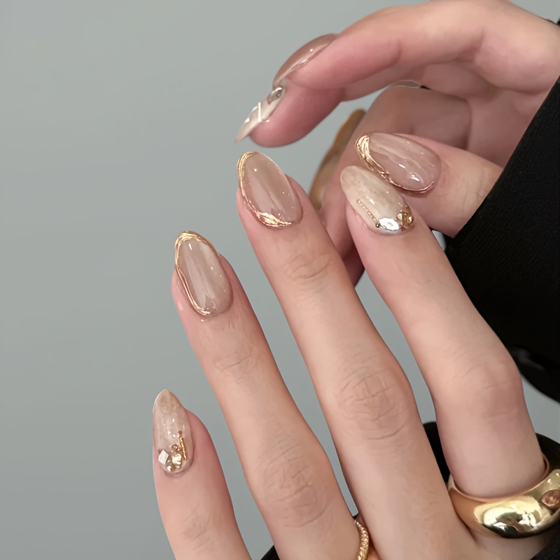 TEMU 24개 아몬드형 인조 네일 세트, 부드러운 스파이럴 디자인의 고급스럽고 우아한 금박 반짝임. 모든 여성에게 적합하며 네일 파일과 젤리 글루 포함
