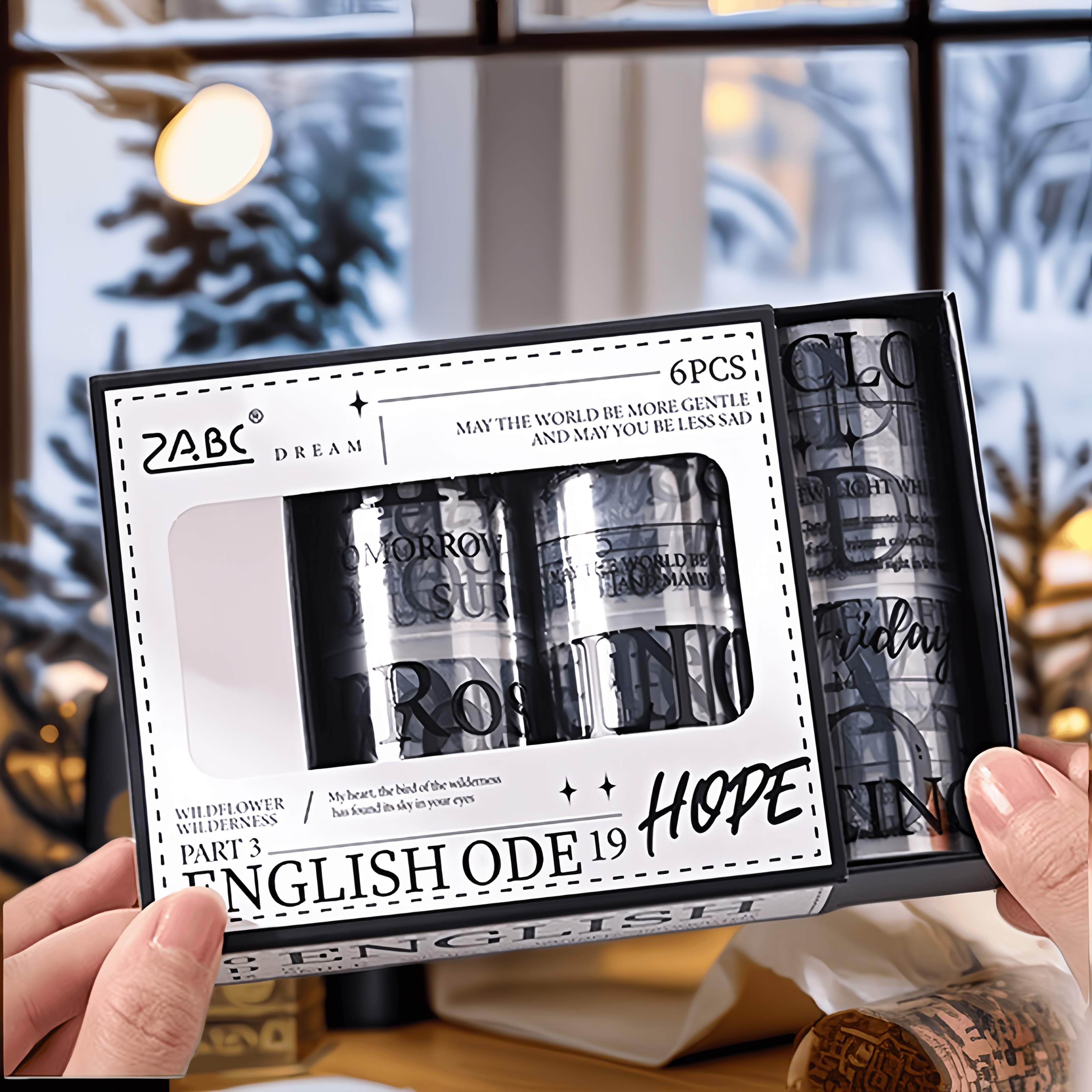 TEMU 6 롤/1 박스 영어 텍스트 선물 상자 세트 조합 테이프 방수 PET 자체 접착 절단 장식 스티커 책 스크랩북, 쓰레기 일기, 공예 책 종이, 스티커 롤에 적합