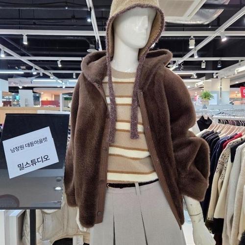 [까르죠아]까르죠아 곰돌이 인조 밍크퍼 후드자켓 겨울 앙고라 여성코트 엄마옷 40대 여성의류