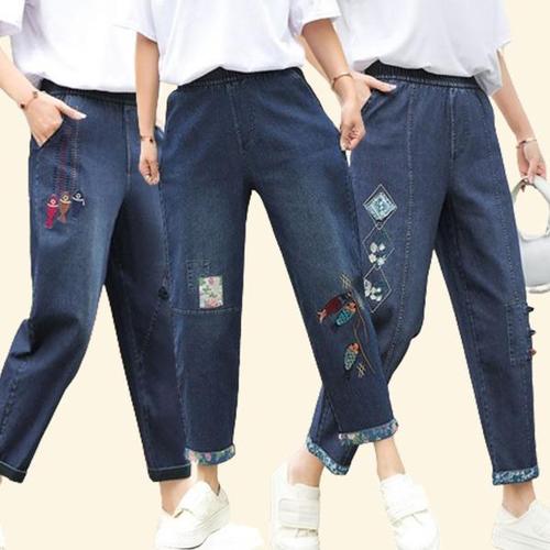 빅사이즈 여성 와이드핏 배기 자수 데님팬츠 루즈핏 9부 청바지 캐주얼 편안한 밴딩팬츠