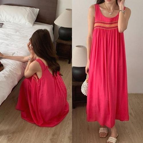 [엄지척]민소매 롱원피스 뒷리본 자수 포인트 여행룩_19914452_667501